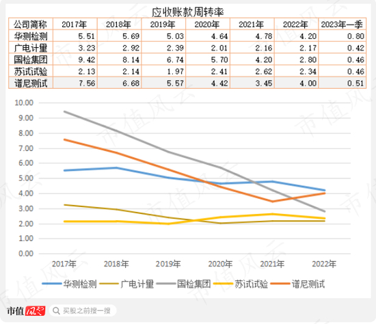 5家公司的应收账款(含应收票据)周转率整体呈现下降趋势,谱尼测试与华测检测也比较接近。
