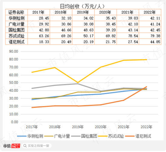 5家公司人均创收保持一定增长,其中,谱尼测试的人均创收数据较低,但在2022年大幅增长,略高于超过华测检测、广电计量和国检集团。