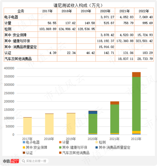 从收入构成看,健康与环比是谱尼测试的主要业务,收入占比在80%以上。此外: