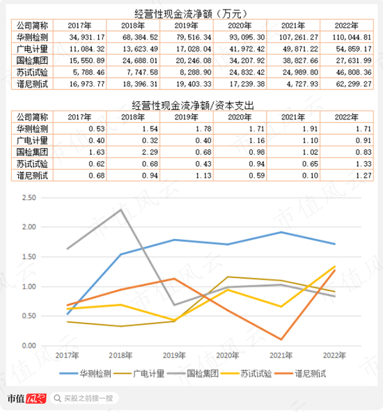 5家公司中华测检测、广电计量、苏试试验等的现金流量资本支出比率呈现上升趋势;谱尼测试的该比例变动较大,该公司经营性现金流净额在2021年大幅萎缩。