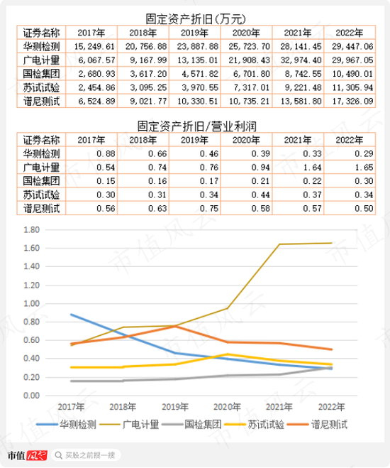几家公司的固定资产折旧金额都比较大,华测检测、苏试试验和谱尼测试3家公司固定资产折旧金额与营业利润的比值整体呈现下降趋势,而华测检测下降更为明显。