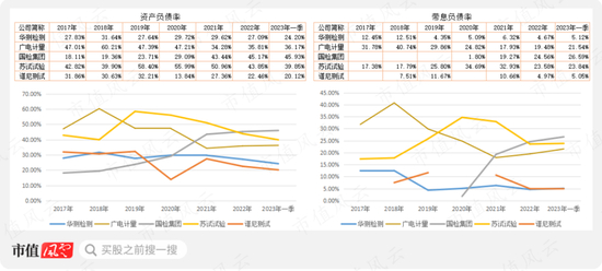 2022年末,谱尼测试最低,为22.5%,华测检测在24.2%,国检集团上升很快,超过45%,苏试试验与国检集团正相反,资产负债率下降明显。