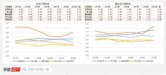 谱尼测试是总资产周转率、固定资产周转率是5家公司最高的,比行业龙头华测检测略高一些。