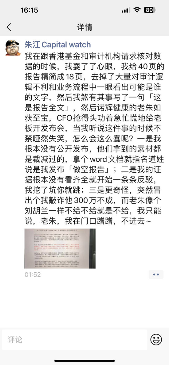 “做空机构通过公关公司多次接触公司寻求合作,但是被公司拒绝了。”董事长兼CEO朱叶青在8月16日的近况交流会上称:“在昨天拒绝了传闻中‘300万公关费’的沟通后,今天上午陆续的有投资人、券商看到了这份报告。我们觉得为这样的事情哪怕付出一分钱都是对诺辉销售的侮辱。”同时,一则疑似诺辉健康IR的社交平台发言记录也在流传,其中提及“要反诉所谓做空机构”等信息。
