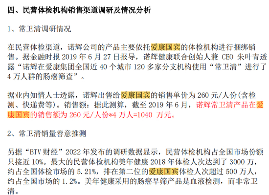 《做空报告》以爱康国宾为主要调研对象,从销售渠道及情况分析,以此推测2022年常卫清的收入。