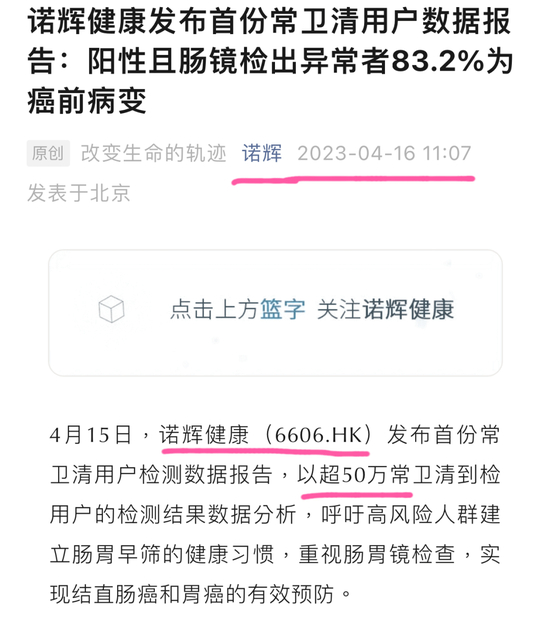 早在2017年,爱康集团就开始与诺辉健康合作,将常卫清 、噗噗管等作为健康咨询项目引入到了爱康平台。2021年,在爱康平台已经有超过20万人运用常卫清进行了肠癌的早期筛查。