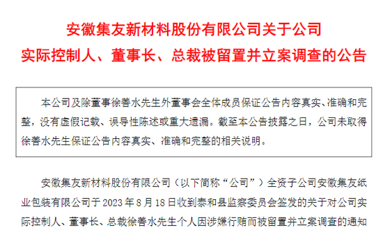 集友股份公告显示,公司全资子公司安徽集友纸业包装有限公司于2023年8月18日收到泰和县监察委员会签发的关于对公司实际控制人、董事长、总裁徐善水个人因涉嫌行贿而被留置并立案调查的通知书。