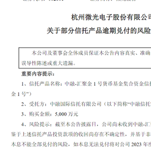 8月21日晚,微光股份发布公告表示,公司部分信托产品逾期兑付,逾期兑付的信托产品受托方为中融国际信托有限公司(以下简称“中融信托”),购买金额为5000万元。公告显示,鉴于上述信托产品投资款项的收回尚存在不确定性,并基于非保本理财产品的性质,存在本息不能全部兑付的风险,如本息无法兑付将对公司2023年度利润产生影响。