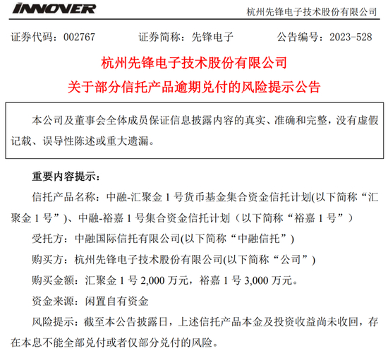 无独有偶,先锋电子8月21日晚间公告,2022年8月15日至17日,公司分别使用闲置资金3000万元、2000万元购买了由中融信托担任受托方的裕嘉1号和汇聚金1号信托产品。截至公告披露日,上述信托产品本金及投资收益尚未收回,存在本息不能全部兑付或者仅部分兑付的风险。