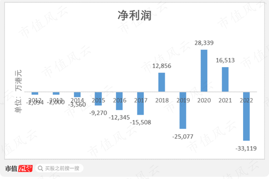 2022年,公司营收仅48万港元,净亏损却达到了创纪录的-3.3亿港元。