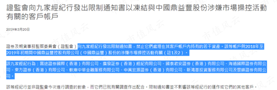 2019年3月20日,证监会发布声明称,已经冻结九家证券公司的部分客户账户中的资产,原因是这些账户涉嫌在2018-2019年操纵公司股价。