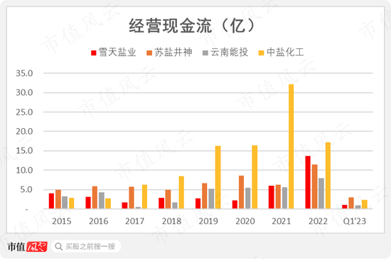 退一步,从经营活动现金流的角度来看,公司近年来持续快速增长,并已经后来居上,赶超了第二名的苏盐井神,从2020年的2.2亿到2021年的6亿,再到2022年的13.6亿。