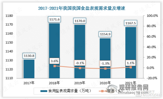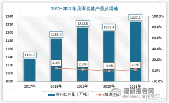 我国原盐中大约有1000万吨左右用于制备食盐,近年来我国食盐产量稳定在1200万吨左右。