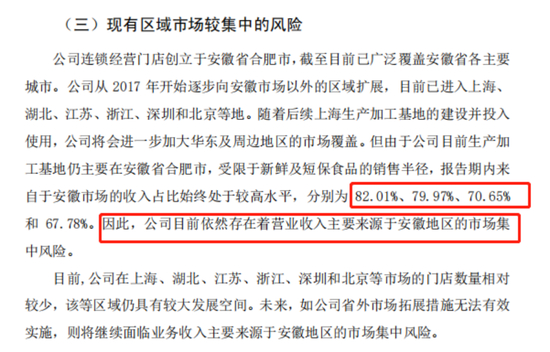 在招股书中,老乡鸡也披露了区域市场集中的风险,报告期内的安徽市场收入占比分别为82.01%、79.97%、70.65%和67.78%。