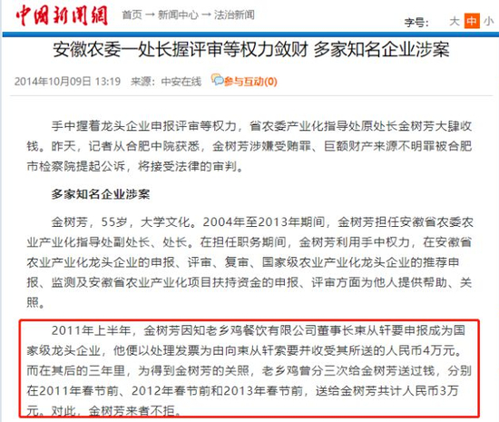 “金树芳案”是继2015年宣判的安徽省农委农业产业化指导处原处长受贿及巨额财产来源不明案件。2014年中国新闻网信息显示,老乡鸡董事长“束从轩”的名字赫然在列。文章披露,束从轩与金树芳有过多次行贿行为,累积金额共计7万元。