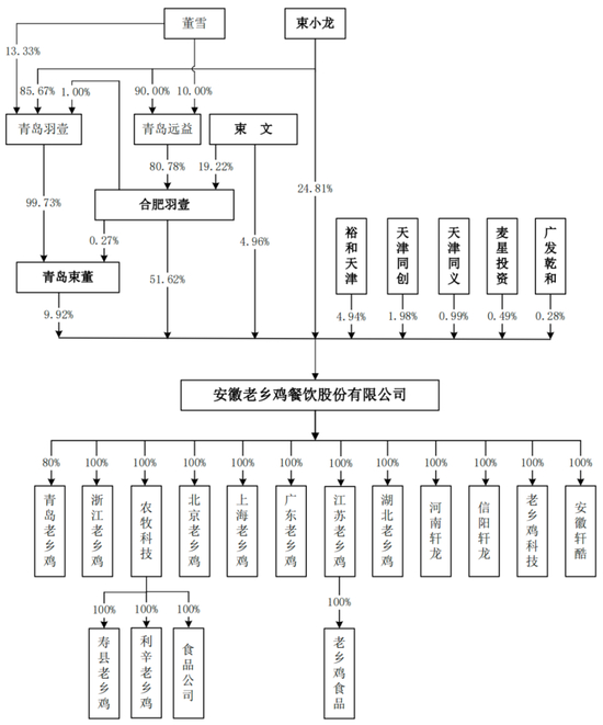 招股书显示,束从轩、张琼、束小龙、董雪、束文5名家族成员为老乡鸡实际控制人。公司董事长束从轩系束小龙、束文的父亲,公司副总经理张琼系束小龙、束文的母亲。其中,束小龙、董雪系夫妻关系,束小龙与束文系兄妹关系,该三人合计持有91.32%的股份。束从轩、张琼虽未持有公司股权,但束从轩对公司事务拥有“一票否决权”。