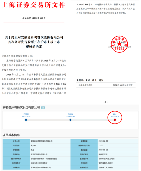 8月28日,老乡鸡沪主板IPO审核为“终止”状态,终止审核的原因是,公司及其保荐人国元证券撤回发行上市申请。