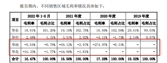 在老乡鸡的主要销售区域——华东地区,报告期内的毛利率分别为20.61%、19.04%、19.10%和18.91%,基本能够接近行业平均值。