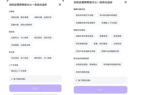 实际上,从文心一言的功能设计也能看出用户的真实体验和反馈对其AI大模型发展的重要性。几乎在每一次与用户的交互后,文心一言都会出现一个比较醒目的按钮图标,方便用户对回答内容和交互体验的评价,用户可以点击赞或者踩,无论点击哪一个按钮,文心一言都会弹出新的窗口,希望用户能更为详细地记录和反馈真实意见。