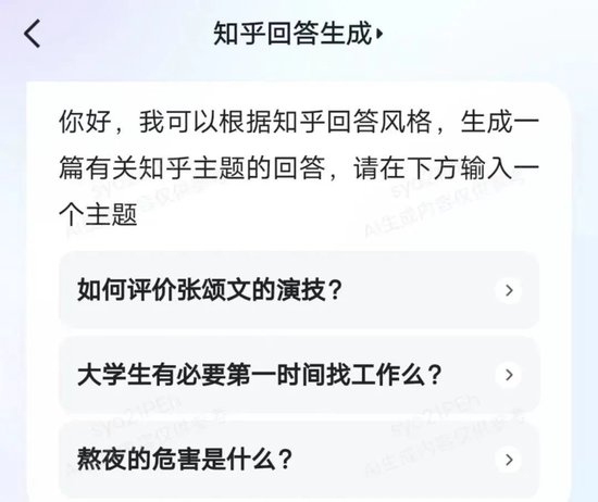 比如点开“知乎回答生成”这个所谓的灵感小工具,就会进入到一个预设好的对话框,文心一言会提供一些预设的问题让用户选择,然后自动模仿知乎平台的回答内容生成文案,用户也可以自由发挥,提出指定的问题让文心一言生成AI答案。