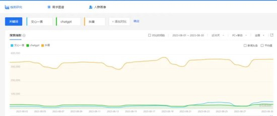 从数据来看也是如此,更多的人或许还并不了解和关注AI大模型。百度搜索指数显示,文心一言、ChatGPT的相关搜索热度始终保持着较为平缓的曲线,并未出现太大的波动,而从热度数值的对比来说,则是远远低于抖音这样的主流App应用。