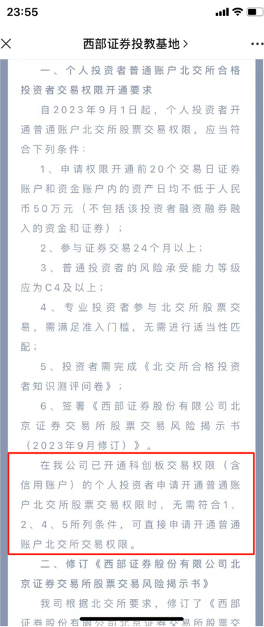西部证券也上线了北交所一键权限交易功能,APP和投教基地都发布了相关提示性公告。在个人投资者开通普通账户北交所股票交易权限中,列出了6点需符合的条件。同时表示,在西部证券已开通科创板交易权限的个人投资者,可进行一键权限开通,但普通投资者的风险承受能力等级应为C4及以上,并需要签署《西部证券股份有限公司北京证券交易所股票交易风险揭示书》。