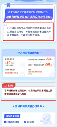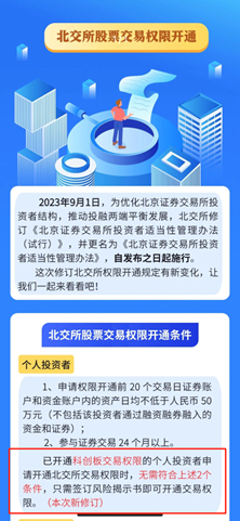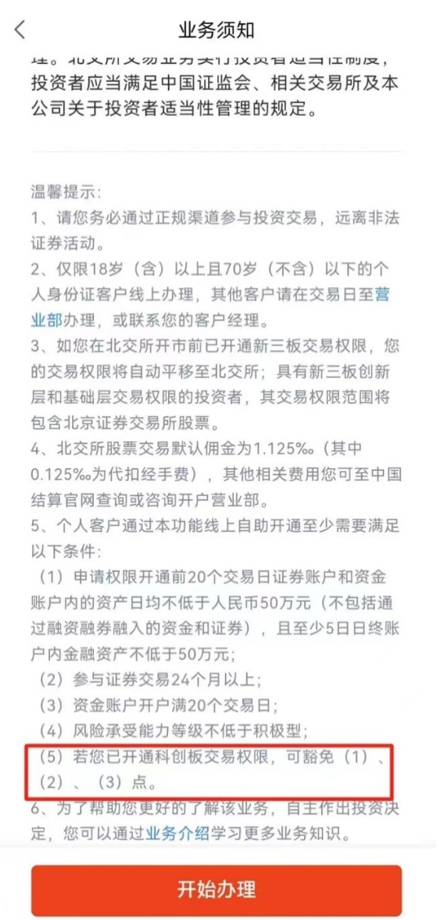 这意味着已开通科创板交易权限投资者申请开通北交所交易权限时,各证券公司不再核验投资者证券资产和交易年限,不再进行知识测评,投资者签订风险揭示书后即可开通北交所交易权限,便利科创板投资者直接参与北交所市场交易。