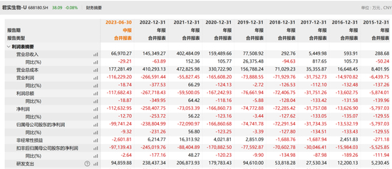 今年上半年,君实生物实现营收6.7亿元,同比下降29.21%;归属于上市公司股东的净利润-9.97亿元,与去年同期相比亏损还有所增加。公司经营活动产生的现金净流出12.26亿元。