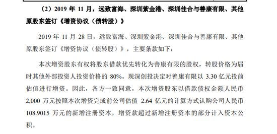 2019年11月,深创投对善康有限(系深圳善康医药科技股份有限公司前身)以3.30亿元投前估值进行增资。