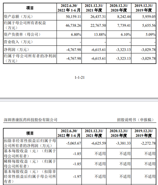 2019年-2021年和2022年1-6月(下称“报告期”),善康医药暂无商业化的产品,公司未产生任何营收,净利润分别为-3029.78万元、-3323.13万元、-6615.61万元、-4767.98万元。也就是说,善康医药此轮是以“零营收,亏损超1.7亿”的业绩冲刺IPO。