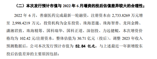 此后,善康医药又进行了多轮融资,在上交所问询中,善康医药表示,2022年6月完成最新一轮融资,注册资本由2733.8万元增至2998.4万元,投资机构为金东投资、珠海思邈、珠海智善、龙岗金腾、潇湘君致、珠海精筹、国科瑞华、国科正道、深创投、力远健鲲,本次增资价格均为102.42元/注册资本,整体估值为30.71亿元(投后)。调整2023年收入预测数据后,善康医药本次发行预计市值为52.84亿元。