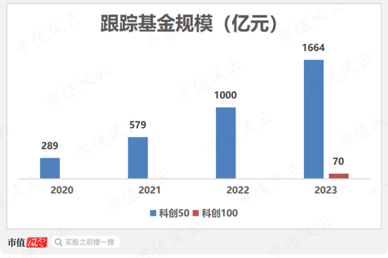 科创50指数自2020年7月发布以来,跟踪它的基金规模飞速增长,三年多时间,数值已来到1664亿,目前跟踪科创100的基金规模仅是科创50的零头。