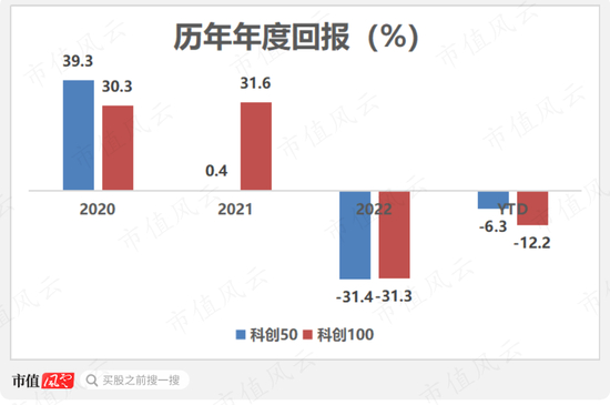 但从历年年度来看,两者表现差异不是很大,2021年由于小盘股起飞,科创100表现要远好于科创50。