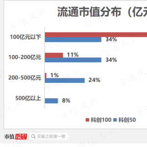 目前科创板总市值约6.7万亿,科创50成分股总市值2.7万亿,占比40%;科创100成分总市值1.4万亿,占比约21%,两者合计占到科创板总市值约六成。