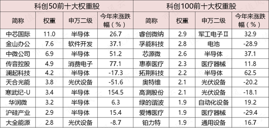 从具体的成份个股来看,科创50前十大权重股合计占比近51%,呈现高度集中状态,同时第一大权重占比为11%;科创100前十大权重不到23%,第一大权重股不到3%,相对而言更分散。