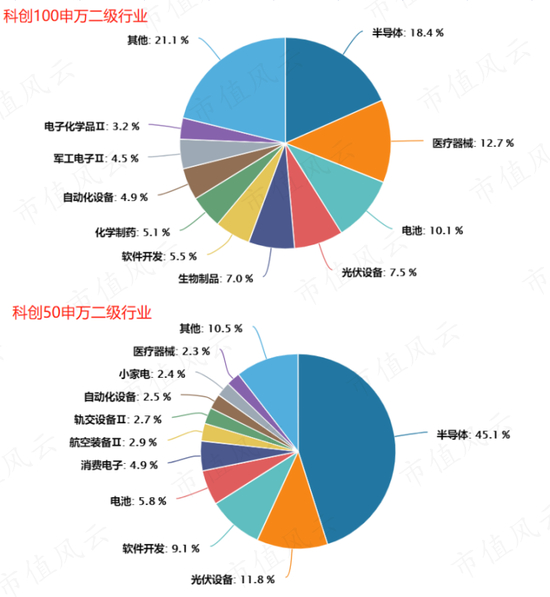 实际上,从申万二级行业来看更为直接,科创50的主题特色是半导体,单一板块占比就达45%,而科创100则是“半导体+医疗+新能源”三足鼎立,三大主题合计占比近半。