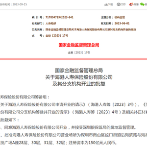 15日,国家金融监管总局官网公布了同意筹建海港人寿保险股份有限公司的批复和同意海港人寿保险股份有限公司及其分支机构开业的批复。