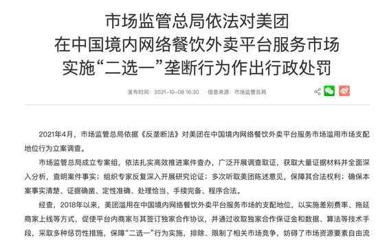 这引起了监管部门的重点关注。2021年10月,监管“靴子落地”,美团吞下34.42亿元的处罚大单,同时被要求整改需在三年内完成。