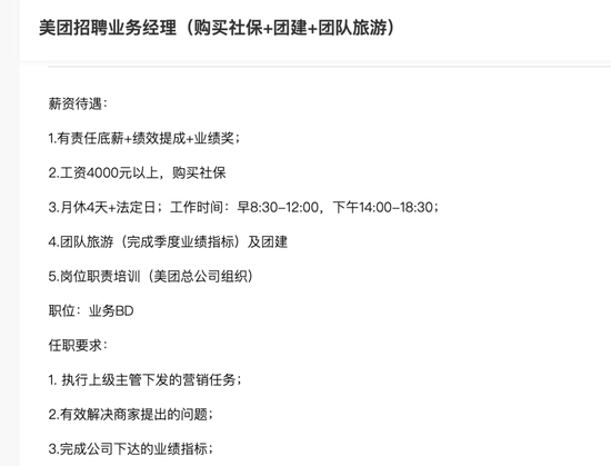 因“二选一”被处罚的英德偕戚,目前正在招聘的业务经理(BD)岗位,就印证了这一点:薪资待遇为有责任底薪+绩效提成+业绩奖;岗位职责由美团总公司组织培训;三条岗位要求中,有两条直接与业绩、营销任务相关:一是要求执行上级主管下发的营销任务、完成公司下达的业绩指标。