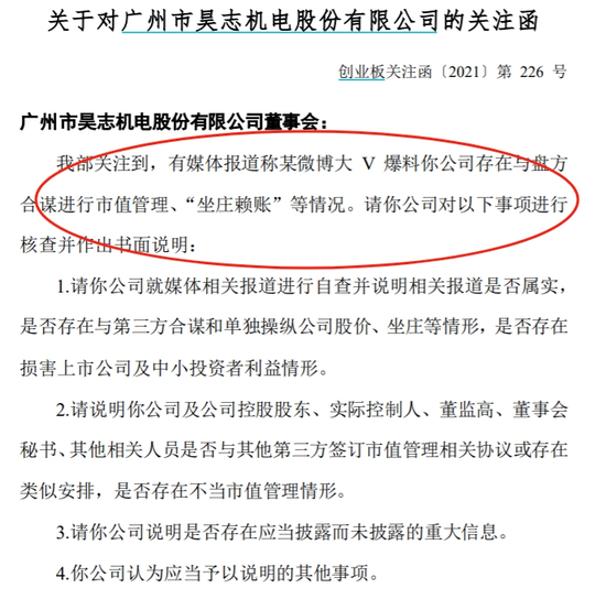 叶飞“爆料门”之后,深交所向昊志机电发出关注函,指出“有媒体报道称某微博大V爆料你公司存在与盘方合谋进行市值管理、“坐庄赖账”等情况”,要求公司说明“相关报道是否属实,是否存在与第三方合谋和单独操纵公司股价、坐庄等情形,是否存在损害上市公司及中小投资者利益情形”,并说明公司及公司高管是否与其他第三方签订市值管理相关协议或存在类似安排,是否存在不当市值管理情形。
