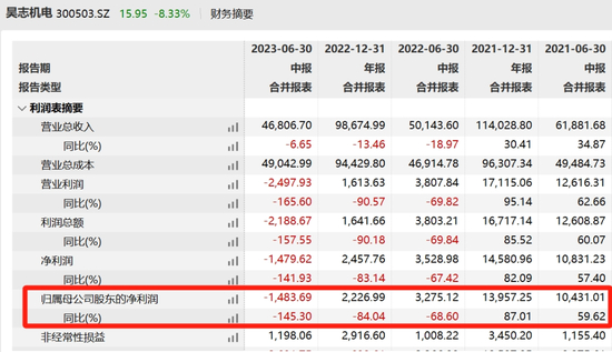 从财务数据来看,昊志机电这一波暴涨也显得有点“无厘头”。2023年中报显示,公司营业利润及归母净利润首次出现亏损,后者亏损接近1500万元,同比下降145%;而在2022年年报中,归母净利润虽然同比下滑84%,但好歹还赚了2227万元。如此看来,年内的经营状况不容乐观。