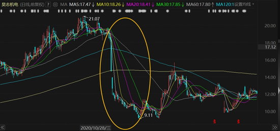 历史股价显示,2020年12月4日,昊志机电的股价展开下跌,12月8日吃下“20cm”大号跌停,12月9日再跌14%。到了2021年1月13日,股价已经惨遭腰斩。