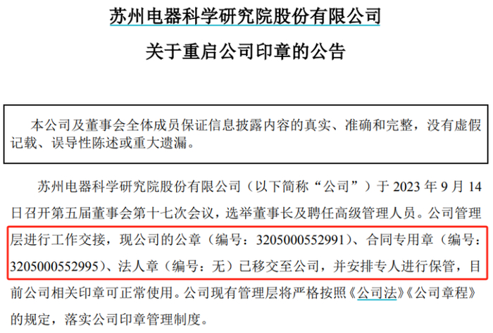 今年4月,电科院宣布其印章停止使用。由于公司在今年1月更换董事长,前任董事长拒不移交公章、合同专用章、法人章,遂宣布三枚印章在2022年11月1日起停止使用。