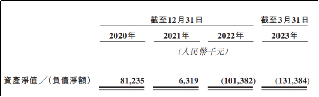 持续的亏损导致公司已资不抵债,招股书显示,2020年至2023年3月底,公司资产净值分别为8123.5万元、631.9万元、-1.01亿元、-1.31亿元。