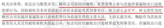裁判文书网显示,金军平身为公司总经理和总裁,决定腾邦公司参与涉案骗税活动,已认定金军平等腾邦公司员工的涉案行为系单位犯罪而非自然人犯罪。