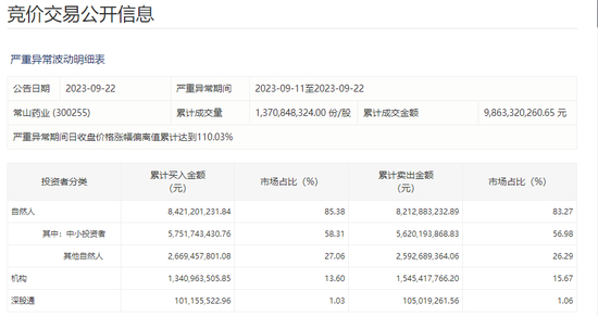 深交所龙虎榜数据显示,在9月11日至9月22日严重异常波动期间,自然人投资者买入力度超过其卖出力度,其中自然人投资者买入市场占比85.38%,卖出市场占比为83.27%;与此同时,上述期间机构投资者买入市场占比为13.60%,不及15.67%的卖出市场占比。深股通买入市场占比为1.03%,亦不及1.06%的卖出市场占比。