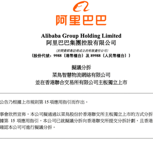 9月26日,阿里巴巴在港交所发布公告称,其拟通过以菜鸟股份于香港联交所主板独立上市的方式分拆菜鸟。分拆完成后,阿里巴巴将继续持有菜鸟50%以上的股份,菜鸟将仍为其子公司。