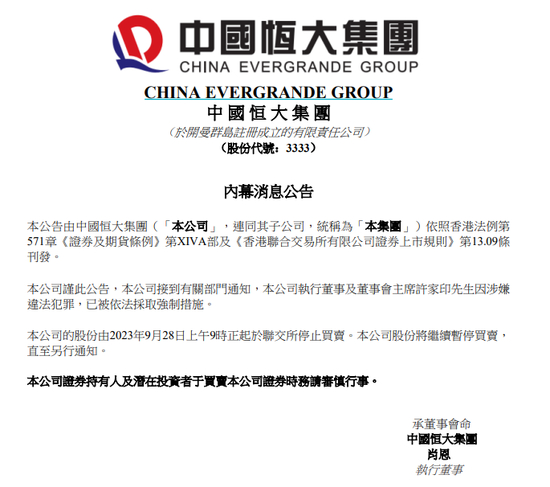 9月28日晚间,中国恒大公告,本公司接到有关部门通知,本公司执行董事及董事会主席许家印因涉嫌违法犯罪,已被依法采取强制措施。