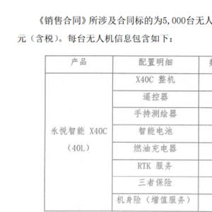8月28日,永悦科技发布公告称,全资子公司盐城永悦智能装备有限公司(以下简称永悦智能)与平舆县畅达交通投资发展有限公司(以下简称“畅达交通”)签订《销售合同》,合同约定畅达交通向永悦智能采购5000台无人机,交易金额为3亿元。