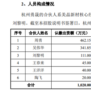 招股书显示,杭州勇晟的持股结构为董事长兼总经理周勇持股45.31%,董事兼副总经理吴伟华持股33.51%,销售总监王春来持股4.41%,制造经理王洋洋持股3.92%,研发经理陶飞持股1.96%。可见,公司核心管理层通过杭州勇晟“白菜价”获得美晶新材大量股权。